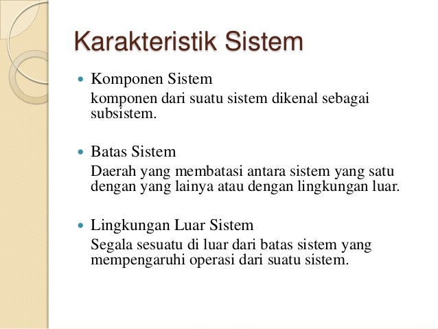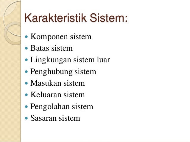 8.  Batas Komponen sistem Karakteristik Sistem: Masukan sistem Penghubung sistem Lingkungan sistem luar sistem  Sasaran sistem Pengolahan sistem Keluaran sistem