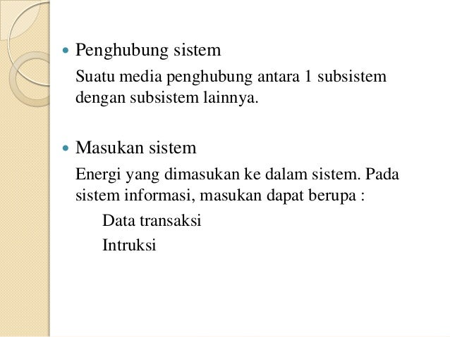 10.  Penghubung sistemSuatu media penghubung antara 1  Masukan sistemEnergi yang dimasukan subsistemdengan subsistem lainnya. ke dalam sistem. Padasistem informasi, masukan dapat berupa :Data transaksiIntruksi