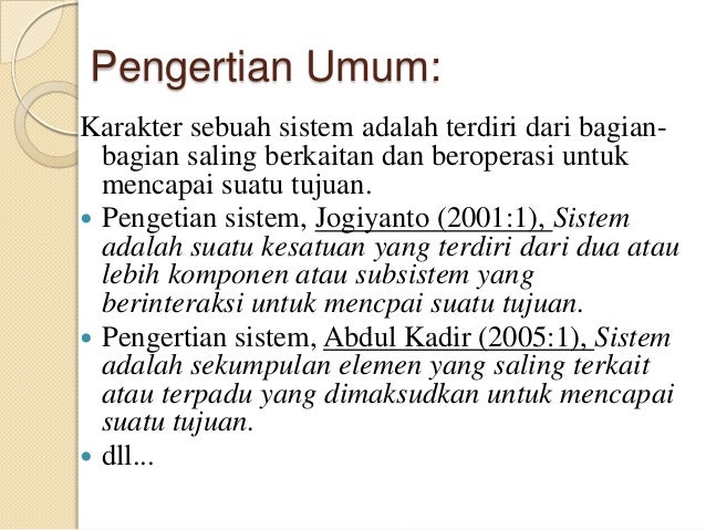 2. Pengertian Umum:Karakter sebuah sistem adalah terdiri dari bagian-bagian saling berkaitan dan beroperasi untukmencapai  Pengetian sistem, Jogiyanto (2001:1), Sistemadalah suatu suatu tujuan. kesatuan yang terdiri dari dua ataulebih komponen atau subsistem  Pengertian sistem, Abdul yang berinteraksi untuk mencpai suatu tujuan. Kadir (2005:1), Sistemadalah sekumpulan elemen yang saling terkaitatau  dll...terpadu yang dimaksudkan untuk mencapaisuatu tujuan.