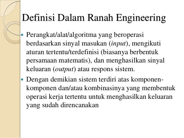 3.  Definisi Dalam Ranah Engineering Perangkat/alat/algoritma yang beroperasiberdasarkan sinyal masukan (input), mengikutiaturan tertentu/terdefinisi (biasanya berbentukpersamaan matematis), dan menghasilkan sinyalkeluaran (output)  Dengan demikian sistem terdiri atas atau respons sistem. komponen-komponen dan atau kombinasinya yang membentukoperasi kerja tertentu untuk menghasilkan keluaranyang sudah direncanakan
