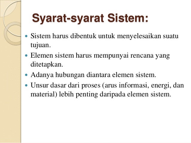 4.  Sistem harus dibentuk untuk Syarat-syarat Sistem:  Elemen sistem harus mempunyai rencana menyelesaikan suatutujuan.  Unsur dasar Adanya hubungan diantara elemen sistem. Yang ditetapkan. dari proses (arus informasi, energi, danmaterial) lebih penting daripada elemen sistem.