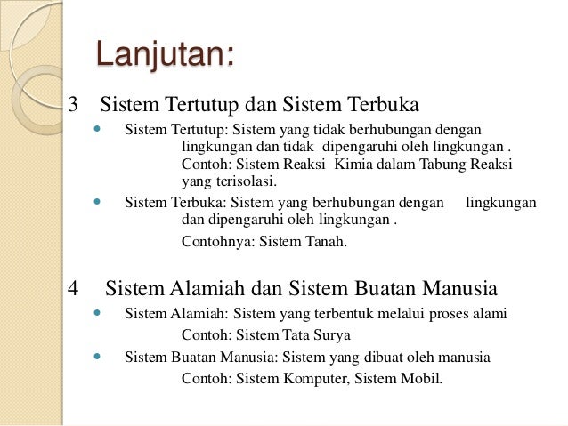 6. Lanjutan:3 Sistem Tertutup dan Sistem Terbuka Sistem Tertutup: Sistem yang tidak berhubungan denganlingkungan dan tidak dipengaruhi oleh lingkungan .Contoh: Sistem Reaksi Kimia dalam  Sistem Terbuka: Sistem yang berhubungan Tabung Reaksiyang terisolasi. dengan lingkungandan dipengaruhi oleh lingkungan .Contohnya: Sistem  Sistem Alamiah: Sistem Tanah.4 Sistem Alamiah dan Sistem Buatan Manusia  Sistem yang terbentuk melalui proses alamiContoh: Sistem Tata Surya Buatan Manusia: Sistem yang dibuat oleh manusiaContoh: Sistem Komputer, Sistem Mobil.